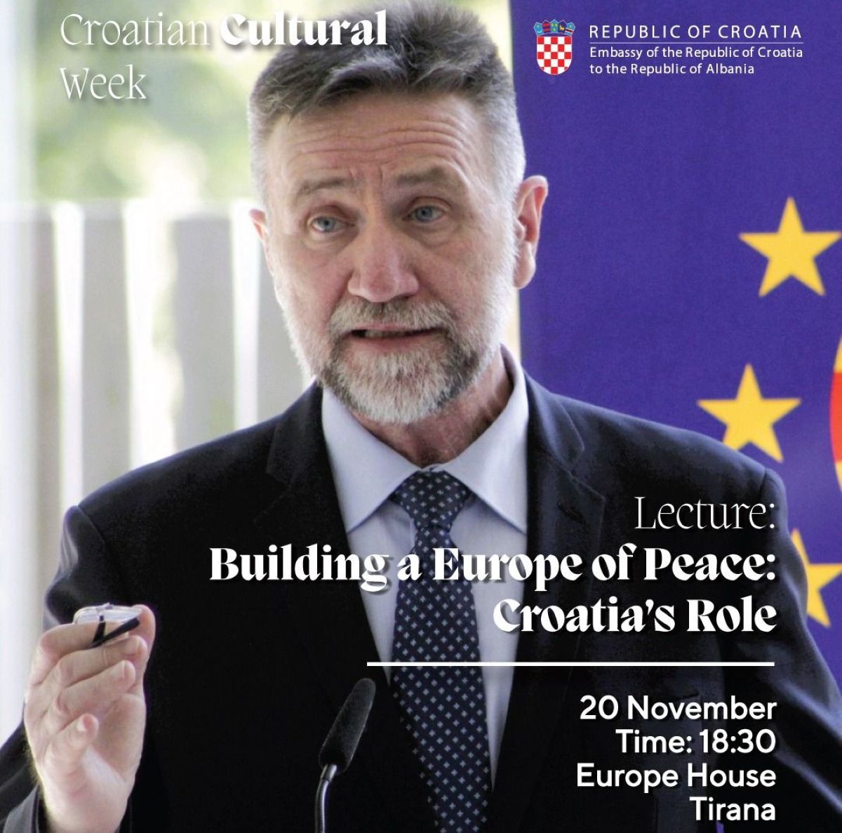 As part of the Croatian Cultural Week organised by the Embassy of the Republic of Croatia in Albania, on 20 November 2025 I delivered a lecture entitled Building a Europe of Peace: Croatia’s Role at the premises of the Europe House in Tirana.